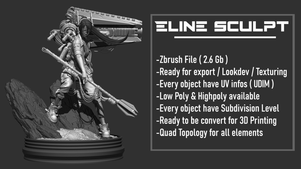 This product contain the Eline Project Sculpt ( Zbrush File ) Project on Artstation : https://www.artstation.com/artwork/GakzWW