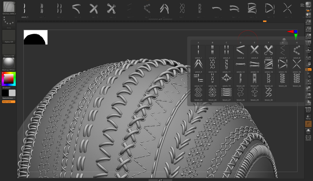 Imm brush are easy to use, just work with the curve system of zbrush, drag your curve, select the stitch you want and it's done !